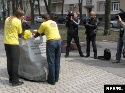 Юнаки та дівчата у жовтих футболках стоять у різних куточках Майдану Незалежності зі стосами книжок у руках. Спочатку просто читають, а потім починають роздавати їх перехожим.