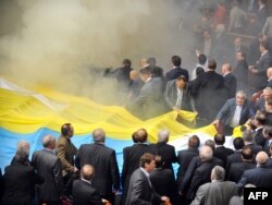 Голова Верховної Ради Володимир Литвин розпочав пленарне засідання під прикриттям парасольок, які тримали його охоронці. Спікера закидали яйцями. У сесійній залі стояла димова завіса. У Верховній Раді на пленарному засіданні зареєструвалися 211 народних депутатів.