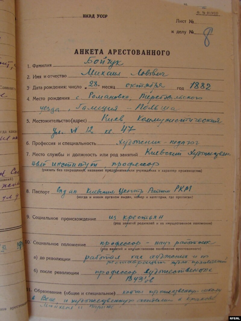 1. Бойчук Михайло Львович, 1882 року народження, уродженець Польщі, колишній професор Київського художнього інституту (справа №267340 Т.9).