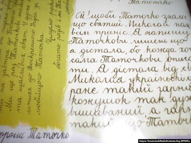 «Я ще не умію писати, але пишу кілька слів, щоби сказати, що я Таточка люблю. Бо я не маю нікого. Мама і тато мені померли. А тут я маю всьо і також Таточка. Я нічого не можу післати Таточкові, лишень рогульок і тісточко».