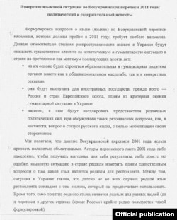 Автори (чи автор) «мовного вимірювання» вже з першого абзацу «беруть бика за роги»: «Дані щодо ступеня поширеності мов в Україні справлятимуть суттєвий вплив на політичну і гуманітарну ситуацію в країні впродовж як мінімум наступних десяти років». До результатів перепису «апелюватимуть представники різних політичних сил при обговоренні таких резонансних питань, як, зокрема, питання про статус російської мови, з метою мобілізації своїх прихильників».