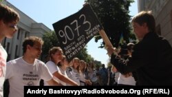 Понад 100 громадських активістів зібрались під будівлею Верховної Ради на знак протесту проти розгляду законопроекту №9073 «Про засади державної мовної політики».