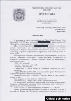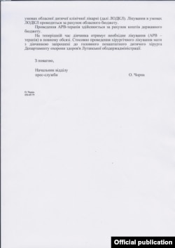 «За інформацією, наданою Департаментом охорони здоров’я Луганської обласної державної адміністрації, дитина регулярно обстежується та оглядається спеціалістами. Останній плановий огляд був проведений у листопаді 2012 року… Останній огляд у Центрі – 11.07.2013. Скарг не пред’являла. До теперішнього часу мати із обстеженням та наглядом погоджувалась (разом із запитом до Міністерства охорони здоров’я Радіо Свобода відправила лист-скаргу Софії про неналежне лікування її дочки, який прийшов від неї у редакцію – ред.). Приймати АРВ-терапію вирішили після закінчення курсу лікування у дерматовенеролога та дообстеження. 11.07.2013 ВААРТ дитині призначена за схемою AZT+3TC+EFV», – повідомляє прес-центр Міністерства охорони здоров’я.