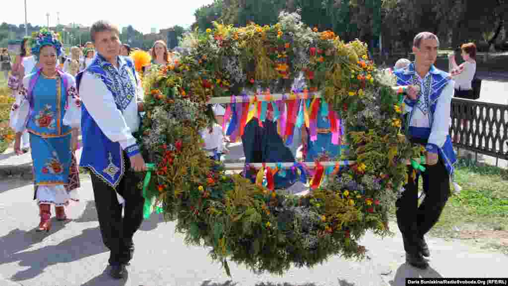 Триметровий вінок із живих квітів сплели у місті Золотоноша Черкаської області. Його презентували під час параду вишиванок Всеукраїнського фестивалю чорнобривців.