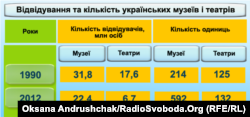 Так, якщо у 1990 році театр відвідали понад 17 з половиною мільйонів українців, то на 2012 рік в Україні залишилося трохи більше ніж 6 з половиною мільйонів театралів. Поменшало і слухачів на концертах класичної музики: із 15 мільйонів на початку 90-х років до 4 з половиною мільйонів минулого року.