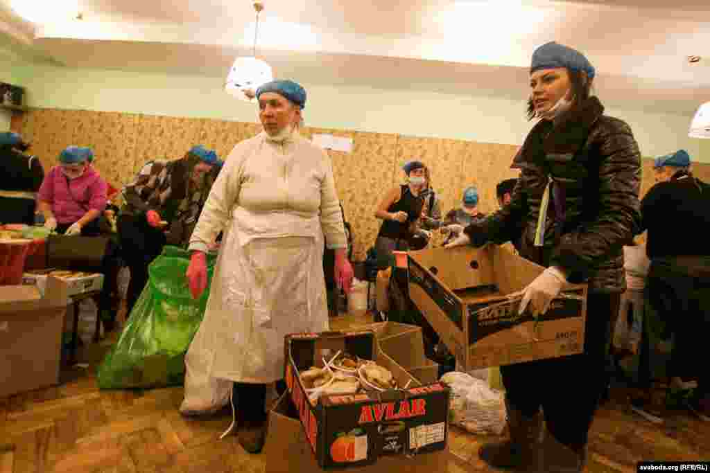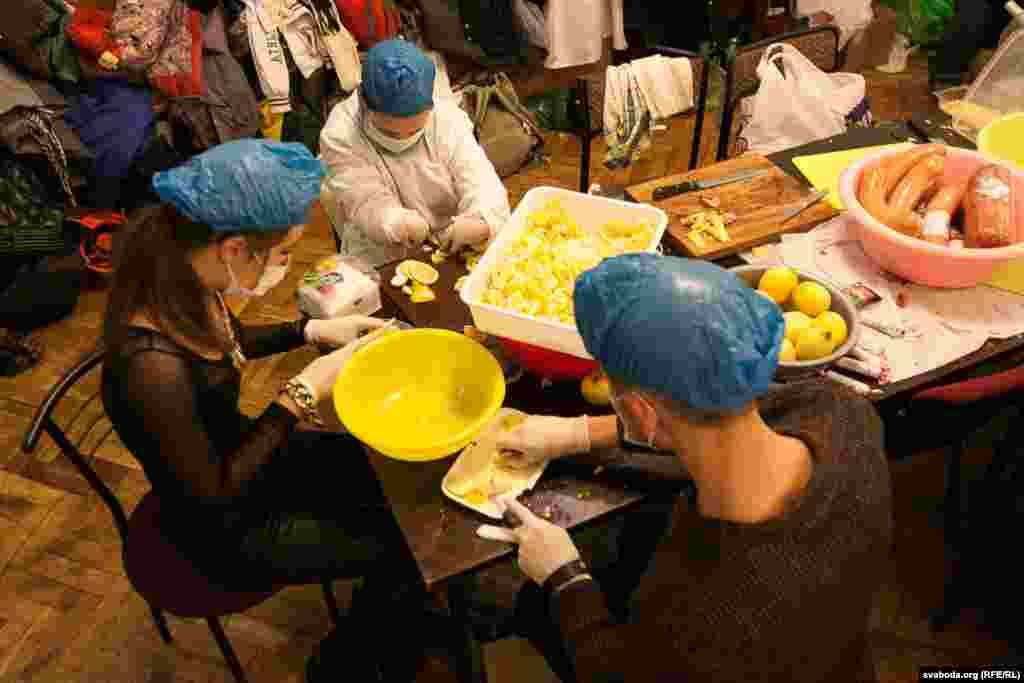 Для забезпечення харчуванням учасників Еврамайдану в будівлі Профспілок працює кухня. Тут працюють волонтери. Одні готують, інші роблять каву і чай, треті розносять їжу. Заради збереження санітарних умов на кухню не так легко потрапити.