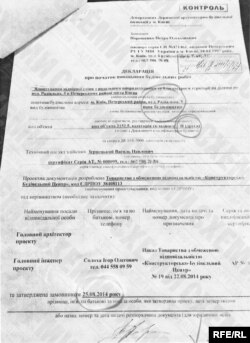 І наостанок. Пам’ятаєте бюрократичний документ – декларація про початок виконання будівельних робіт, яку нам передали у кафе? Поштова адреса – та ж сама, що і першої ділянки – на Радіальній,5. В декларації знову йдеться про облаштування підпірної стіни. Знову – підпис Порошенка. Знову – не п’ята, а друга категорія складності, знову – без дозволу Мінкультури. Лише рік інший – 2014.