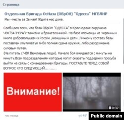 «Повідомляємо всіх, що база ОБрСН «ОДЕСА» у Краснодоні оточена ПВК Вагнера з танками і бронетехнікою. На базі ополченці з України та багато добровольців із Росії, жінки і діти. Особовому складу бази поставили ультиматум: або повна здача зброї, або роззброєння силовим шляхом», – таке повідомлення з’явилося на офіційній сторінці «Одеси» в соцмережі «ВКонтакте».