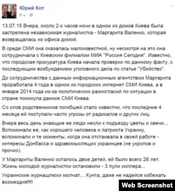 «У вівторок, 14 липня, з’явилася інформація, що в ніч на понеділок в Києві розстріляли незалежну журналістку Маргариту Валенко, яка була супротивницею нацистського розвитку України. За деякими даними, кілер чекав на 26-річну дівчину прямо біля дверей її квартири, а коли та повернулася додому, випустив у неї три кулі», – йдеться у повідомленні на порталі видання «Комсомольская правда».