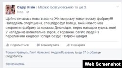 «Щойно почалась нова атака на Житомирську кондитерську фабрику! Нападають спортсмени. Спецпідрозділ поліції, який нібито мав охороняти фабрику за наказом Деканоїдзе, перед нападом кудись зник! У нападників вогнепальна зброя, є поранені, багато людей з переломами кінцівок! Поліція бездіє. Потрібні швидкі!» – написав Кізін.