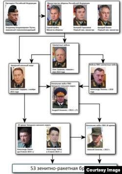 Ланцюжок, яким передавалося рішення про використання російських «Буків» у війні в Україні – інфографіка Bellingcat: