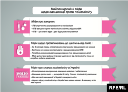В Україні відбулися три раунди вакцинації проти поліомієліту у зв’язку зі спалахом цього захворювання (у серпні 2015 року виявили два випадки вакциноспорідненого поліомієліту на Закарпатті, представники ВООЗ запевняють, що навіть один випадок захворювання є спалахом). У жодному з раундів не вдалося досягти 95-відсоткового охоплення дітей, а саме таку цифру охоплення для подолання поліомієліту називали у Всесвітній організації охорони здоров’я як одну з головних умов на шляху до перемоги над поліовірусом. Лише після того, як відсоток вакцинованих дітей буде становити необхідну цифру, відповідні організації, що залучені до боротьби, зможуть констатувати перемогу України над поліовірусом, що циркулює, зауважувала представник ЮНІСЕФ в Україні Джованна Барберіс. Подекуди серед батьків все ще побутують чутки, які заважають їм приводити своїх дітей на вакцинацію. Вони породжують численні міфи, які не пов’язані з реальністю, кажуть медики.