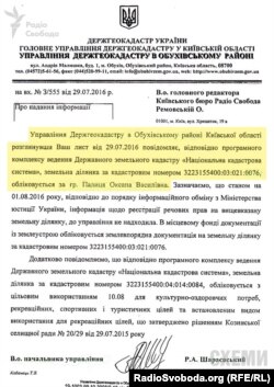 Але за збігом обставин після того, як журналісти програми надіслали листа до Адміністрацію президента, ці документи з’явилися в Держгеокадастрі Обухівського району.