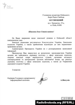 У відповіді на запит за підписом керівника головного департаменту інформаційної політики Адміністрації президента Андрія Жигуліна йдеться: «Земельні відносини регулюються Конституцією України, Земельним кодексом України. Адміністрація президента України не є розпорядником запитуваної інформації. Пропонуємо Вам звернутися до визначених законодавством України органів, які здійснюють державну політику у сфері земельних відносин, зокрема земельні спори вирішуються судами, органами місцевого самоврядування та центральним органом виконавчої влади, що реалізує державну політику у сфері земельних відносин, а також до Управління державної охорони України».