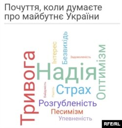 «Надія» – слово, яке, за результатами опитування, найточніше характеризує почуття українців, коли вони думають про майбутнє своєї країни. «Ми живемо в напруженому суспільстві, але досі зберігаємо здоровий глузд і можливість адаптуватися до цієї ситуації», – коментує результати дослідження заступник голови Інституту соціології НАНУ Євген Головаха.