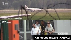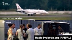 Пасажирами літака виявились депутат від «Опозиційного блоку» Нестор Шуфрич та колишній голова Адміністрації президента Кучми і кум президента Росії Путіна Віктор Медведчук. Ось Шуфрич та Медведчук із родинами залишають VIP-термінал.