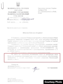 Аналогічну відповідь від СБУ отримала народний депутат Світлана Заліщук, яка направила запити на наше прохання. Щоправда, у Національній поліції їй повідомили, що «направлено мотивованого листа до прокуратури міста Києва для визначення підслідності досудового розслідування у кримінальному провадженні за слідчим управлінням Головного управління Національної поліції у м. Києві». Вже бодай щось.