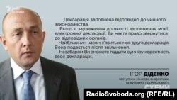 Ігор Діденко зазначив, що інформацію, отриману під час зустрічі, можна використовувати у спосіб, не заборонений законодавством. Ось кілька недослівних тез, озвучених ним, серед яких і натяк на звільнення найближчим часом: «Декларація заповнена відповідно до чинного законодавства. Якщо є зауваження до якості заповнення моєї електронної декларації, ви маєте право звернутися до відповідних органів. Найближчим часом з’явиться моя друга декларація. Вона подається після звільнення. Незабаром ви зможете піддати сумніву коректність двох декларацій».