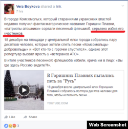 Телеканал Міністерства оборони Росії із посиланням на сайт «Политнавигатор» розмістив сюжет із заголовком: «Бойовики ЗСУ побили людей за пісню «Прощание славянки»». До новини підкріпили відео: біля місцевої ялинки чоловік у військовій формі сперечається із учасником флешмобу. Той каже, що прийшов на подію «за Україну», на що чоловік у військовій формі відповідає: «А слова пісні ти читав?». На відео видно червоні плями на снігу. Канал «Звезда» пише, що це – кров.