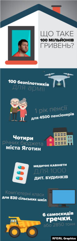 Щоби зрозуміти, наскільки значущою може бути сума у 100 мільйонів гривень, її можна обрахувати в бюджетах міста Яготин, що у Київській області. Витрати цього 20-тисяного населеного пункту на рік – 26 мільйонів гривень.
