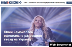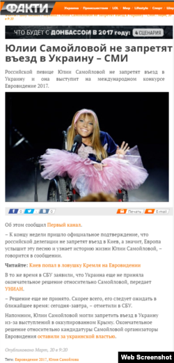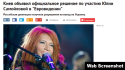 Російський канал «РЕН-ТВ» у понеділок повідомив: «Україна ухвалила офіційне рішення щодо участі російської співачки Юлії Самойлової в міжнародному конкурсі «Євробачення». Київ дозволив в’їзд у країну Самойловій для участі в конкурсі. Російська делегація вже отримала відповідне підтвердження наприкінці минулого тижня, повідомляє URA.ru. Відзначається, що СБУ не стала обмежувати в’їзд Самойлової в країну».