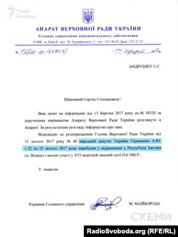 Апарат Верховної Ради письмово повідомив програму «Схеми», що Геращенко, починаючи з 22 лютого, перебував в офіційному відрядженні в Австрії.