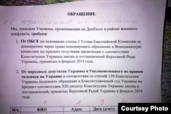 Один из радиослушателей «Донбасс.Реалии» – рабочий одной из донецких шахт – прислал нам фото «обращения», под которым «руководство» предприятия заставляло ставить подписи. Это обращение состояло из двух требований. Первое из них выглядит так: «Мы, граждане Украины, проживающие на Донбассе, в районе военного конфликта, требуем от ОБСЕ инициировать обращение в Венецианскую комиссию на предмет соответствия Конституции Украины законов, принятых Верховной Радой в феврале 2014 года»