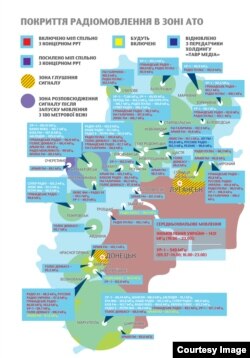 Це були такі передавачі: «Громадське радіо» – 11 передавачів, «Голос Донбасу» – 8 передавачів, УР1 – 8 передавачів (тільки в зоні АТО, насправді, для УР1 було встановлено понад 20 передавачів FM по всій Україні), «Русское Радио Україна» – 2 передавачі, радіо «Люкс» – 1 передавач, радіо «Пульс» – 4 передавачі, «Радіо 24» – 2 передавачі, «Класне радіо» – 1 передавач, офіційно встановлено 11 передавачів «Армія ФM» (Бахмут, Новотошківкa, Широкинe, Світлодарськ, Красногорівка, Очеретинe, Новоайдар, Станиця Луганська, Волноваха, Маріуполь, Краматорськ), та нещодавно включено 6 радіопередавачів «ФM-Галичина» (Новоайдар, Бахмут, Старобільськ, Широкий, Лисичанськ, Сватове).
