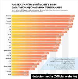 Національна рада з питань телебачення та радіомовлення ще у березні моніторила українські телеканали на предмет того, скільки україномовного контенту вони транслюють. Тоді «антилідерами» були «Інтер» та «Україна» – по 26%, К2 – 36%, «Enter фільм» – 39%.