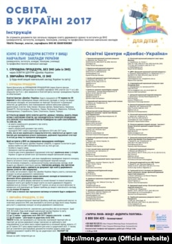 19 червня починають роботу освітні центри «Донбас-Україна» – там жителі окупованих територій і населених пунктів, де проходила антитерористична операція, зможуть подати документи в університети без сертифікату зовнішнього незалежного оцінювання. Ці центри розташовані на базі вищих і середніх спеціальних закладів на Донбасі, а також в евакуйованих з Донецька і Луганська вишах. Утім, правозахисники кажуть: спрощений порядок вступу треба було запроваджувати для всіх українських вишів, а не тільки тих, що на Донбасі.