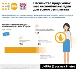 Насильство щодо жінок має економічні наслідки і суму втрат для України у цьому напрямку підрахували у Фонді ООН у галузі народонаселення (UNFPA). За висновками фонду, ці витрати сягають десятків мільйонів доларів, а із врахуванням прихованого характеру проблеми вартість насильства у 20 разів більша за офіційну статистику. Дії щодо попередження насильства щодо жінок в Україні реалізовується переважно за рахунок міжнародних донорів. До того ж депутати Верховної Ради досі не ухвалили закони, спрямовані на запобігання та протидію проблемам у цій сфері.