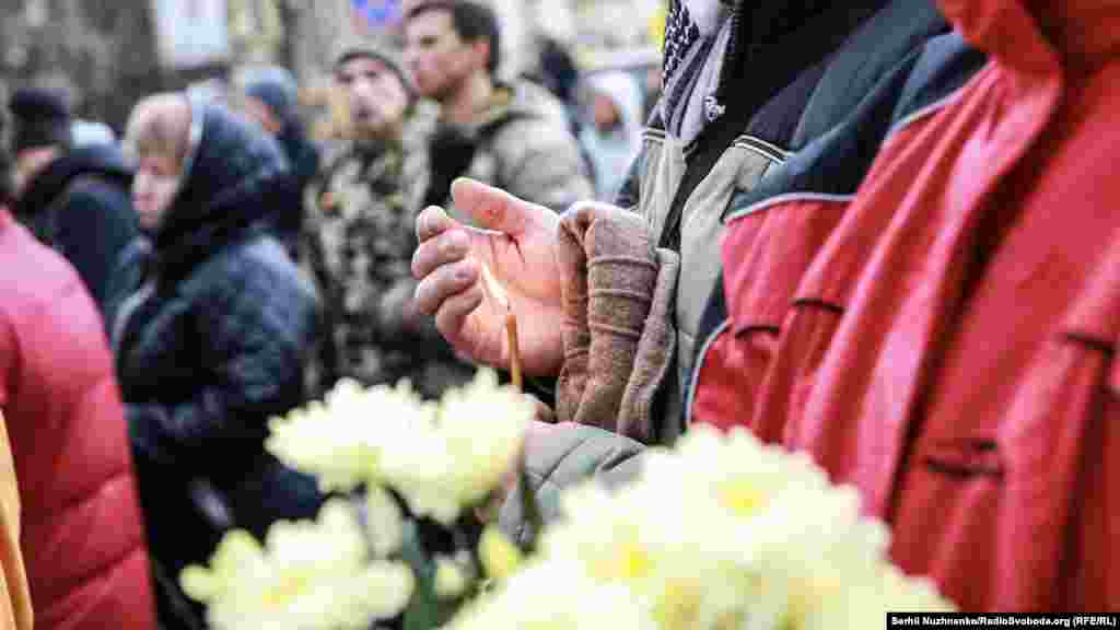 Кияни, очевидці тих подій та родичі полеглих несуть квіти та лампадки до Алеї Героїв Небесної сотні. Біля Хреста пам'яті Героїв Небесної сотні відбувся спільний поминальний молебень, присутні вшанували пам'ять загиблих під час подій 2014-го хвилиною мовчання.