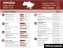 Україна посіла 132 місце у рейтингу та отримала загальну оцінку 6,53 за особисті свободи та 5,38 за економічні свободи. Грузія, наприклад, посіла 40 місце з загальним рівнем свобод 7,74, Молдова – 83 місце, Росія – 126, а Китай – 130.