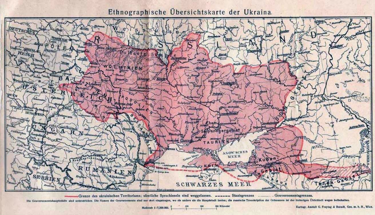 Етнографічна оглядова карта України, видана у Відні у 1916 році. (Щоб відкрити мапу у більшому форматі, натисніть на зображення. Відкриється у новому вікні)