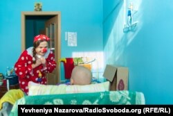 Клоунський образ волонтерки майже готовий: чорне трико та легінці, яскраво-рожеві фітинова спідниця та шапка-ковпак. Останній штрих – підфарбувати губи. І жінки рушають кликати дітей, котрі лежать у відділенні, на міні-свято, що влаштовують разом з іншими волонтерами та представниками Червоного Хреста.