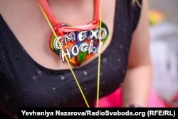 Світлана Ушакова демонструє свій «реквізит»: комбінезон із різнокольорових смуг, жовтий поролоновий шарик-ніс та невеличкий дитячий кулон для надування мильних бульбашок. Ось і все необхідне для перевтілення у клоуна. І жодної фарби для гриму.