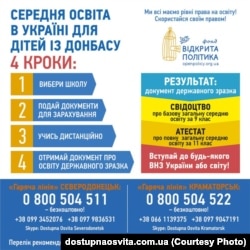 Шаг 1. Выбрать школу на подконтрольной Киеву территории, где вы сможете учиться дистанционно или сдать экзамены экстерном, чтобы получить свидетельство о среднем образовании государственного образца. Со списком таких учреждений можно ознакомиться на официальных сайтах департаментов образования и науки госадминистраций Луганской и Донецкой области или позвонив по телефону: в Луганской области – +38 (06452) 5‑48‑73 (Северодонецк); в Донецкой области – +38 (095) 314‑15‑75, +38 (067) 116‑44‑54 (Славянск).
