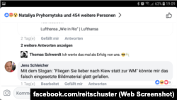 «Із закликом: «Летіть краще до Києва, ніж на Чемпіонат!» – мені б неправильно використаний фотоматеріал ще й сподобався», – пише користувач мережі «Фейсбук» Єнс Шляйхер.
