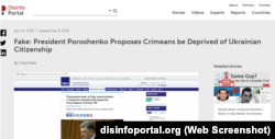 Hdisinfoportal.org також пропонує розвінчання «фейку» про те, що президент України Петро Порошенко нібито запропонував позбавляти мешканців Криму українського громадянства. Порошенко справді вніс проект змін до закону «Про громадянство України» на розгляд парламенту. Але, як пояснюють у матеріалі, російські ЗМІ повністю проігнорували той факт, що запропоновані поправки, про які йшлось, захищають українське громадянство у випадках, коли нове громадянство приймається під примусом, як це відбувається в окупованому Росією Криму.