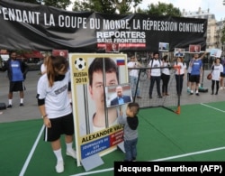 Активісти кампанії за свободу преси 13 червня створили імпровізований футбольний газон в центрі Парижа і розмістили на ньому постери з зображеннями ув’язнених російських журналістів.