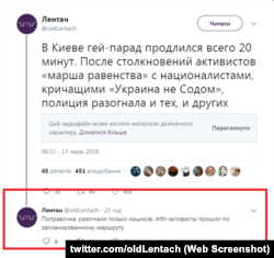Щоправда, пізніше видання «Лентач» вибачилось і додало, що ЛГБТ-активісти пройшли запланованим маршрутом.