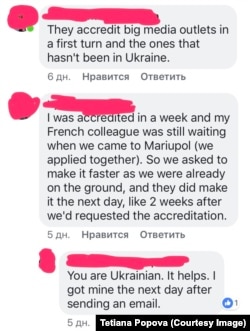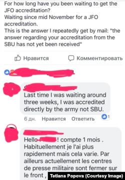 Наразі я перебуваю в закритій групі для іноземних журналістів у соціальних мережах, де щонайменше десяток представників ЗМІ спілкується між собою з питань акредитування. Зазвичай середній строк, про який вони говорять, для отримання акредитації – це місяць. У грудні 2014 року я розробляла порядок оформлювання прес-карток АТО за акредитацією в СБУ, і ми говорили, що потрібно буде щонайбільше день на акредитацію та ще кілька днів на отримання прес-карток. Зараз цей строк для іноземних журналістів триває близько місяця.