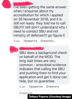 – Я отримував таку саму відповідь, коли запитував про свою акредитацію, на яку подав заявку 26 листопада 2018 року, і вона ще не готова. Вони сказали мені звернутися до СБУ!!! Досі не розумію, чому мені потрібно звертатися до СБУ, а не до Міністерства оборони!!! Піди й з’ясуй.