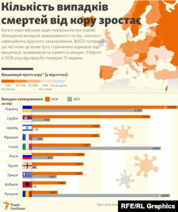 Кількість хворих на кір у Європі у 2018 році сягнула понад 82 тисячі людей – це найвищий показник десятиліття, йдеться у звіті Всесвітньої організації охорони здоров'я (ВООЗ) для Європейського регіону. Загалом на континенті від кору загинуло 72 людини, з них 16 – в Україні. Друге місце в Європі із захворюваності на кір після України посідає Сербія. Тут 5076 людей занедужали на цю хворобу, 15 випадків летальних.