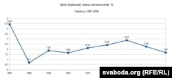 На графіку, який наводимо нижче, за даними переписів подається динаміка частки українців у складі населення БРСР та Республіки Білорусь, а також Мінської, Могильовської, Вітебської, Віленської , Гродненської губерній Російської імперії (1897).