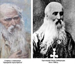 – Так, це було цілком логічно припустити. Також виглядало логічним, що і двоє інших образів – свідків хрещення Ісуса – можуть мати прототипи. Я уважно дослідила композицію: один з її героїв, старець, напрочуд схожий на протоієрея Софійського собору та одного з перших дослідників храму Петра Лебединцева.