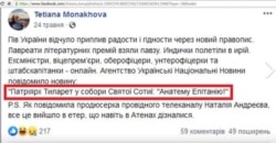 Мабуть, такі думки про правопис не випадкові. На її сторінці в соцмережі активісти знайшли допис, який шокував брутальним його перекручуванням («Свята Сотия», «Тиларет», «Епітаній»).