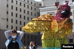 У Казахстані також перехожі почали перейматись скульптурами у вигляді тварин. Цю величезну маску вдягли на інсталяцію білки в Алмати.