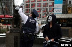 А це – пам'ятник чи не найвідомішому псу планети – Хатіко. На фото токійський полісмен знімає маску, яку небайдужі перехожі вдягли на песика.