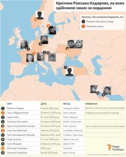 Правозахисні групи звинуватили Кадирова, який править у Чечні з 2007 року, у численних порушеннях прав людини, включно з викраденням людей, тортурами, позасудовими вбивствами, зникненнями та цілеспрямованими вбивствами політичних та особистих конкурентів як у Росії, так і за її межами.